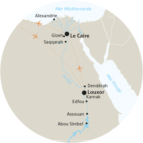 Un simple coup d’œil sur une carte de l’Égypte suffit à saisir l’importance vitale du Nil, ce fleuve nourricier qui a bercé les premières civilisations. Sur ses rives, les pharaons ont bâti des cités grandioses, vestiges d’un passé glorieux. Aujourd’hui encore, le Nil irrigue des terres fertiles où s’épanouissent de grandes villes et de charmants villages aux couleurs chatoyantes. Notre croisière, de Louxor à Assouan, nous invite à un voyage dans le temps, à la découverte des secrets de l’Égypte antique et des mystères qui entourent les pharaons.