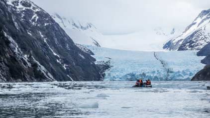 Ce glacier appartient au Parc National Alberto de Agostini à l’extrémité du continent où la cordillière de Darwin s’entaille profondément en plongeant dans l’océan. On arrive au glacier en empruntant le fjord qu’il a creusé où les glaces flottantes sont de plus en plus nombreuses à mesure qu’on approche du fond. Le front du glacier, d’un bleu irréel continue de reculer en lâchant dans l’océan des blocs de toute taille.