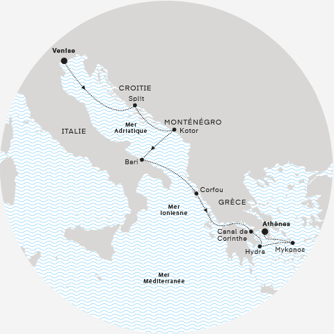 De notre yacht, nous aurons la chance de partager des moments de navigation exceptionnels : appareillage de Venise au coucher du soleil, traversée des majestueuses Bouches de Kotor et passage du Canal de Corinthe.