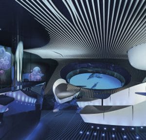 Le Champlain est équipé de multiples innovations, à commencer par le salon d’observation multi-sensoriel Blue Eye situé sous la ligne de flottaison, une première mondiale. (Lisez aussi notre article sur le salon Blue Eye)