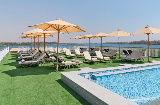 Détendez-vous dans les chaises longues autour de la piscine en prenant un bain de soleil Egyptien.